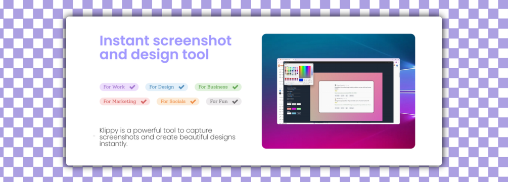 Klippy is a powerful tool to capture screenshots and create beautiful designs instantly.
